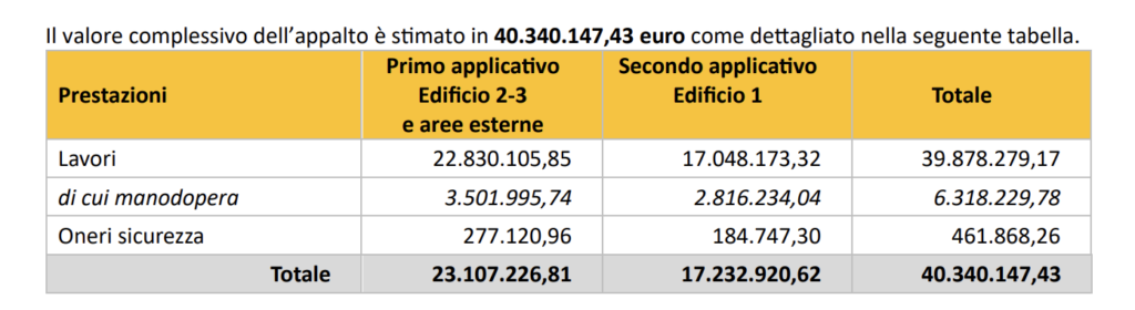 Il criterio di aggiudicazione scelto è quello dell’offerta economicamente più vantaggiosa, con 30 punti per la componente economica e 70 punti per l’offerta tecnica. Riguardo ai criteri di valutazione dell’offerta tecnica, sono assegnati: 25 punti per proposte migliorative (progettazione costruttiva e as-built in bim; miglioramento qualità delle finiture; ulteriori proposte migliorative e integrative); 25 punti per sostenibilità ed efficienza (strategie per riduzione dei costi di manutenzione e gestione dell’opera; risparmio energetico; migliorie facciate continue; impianto fotovoltaico; miglioramento opere a verde; utilizzo della ferrovia come sistema di trasporto delle strutture; gestione rifiuti); 10 punti per esperienze e referenze (best practices, struttura tecnico-organizzativa, certificazioni); 10 punti per gestione cantiere (riduzione dei tempi di realizzazione dei lavori; proposte migliorative per la gestione delle interferenze del cantiere con la normale operatività del polo; rumori cantieri; provvedimenti per migliorare la sicurezza dei cantieri; abbattimento polveri; piano di informazione al pubblico e ai residenti).