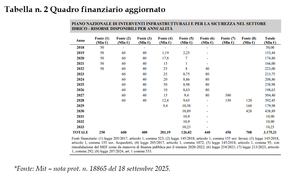Nel ricostruire il quadro finanziario del PNIISSI, il CCC pubblica anche una tabella di grande utilità sulla ripartizione negli anni, fino al 2033, dei 3.175,21 milioni disponibili a oggi per il Piano, accogliendo, non del tutto convintamente, anche l’osservazione del MIT che una simile ripartizione deve necessariamente portare a un’attuazione per stralci annuali successivi. Qui di seguito la tabella, tratta dalla delibera.