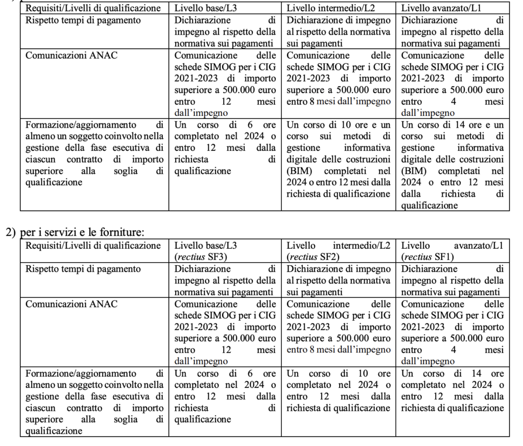 - comma 2: a decorrere dal 1° gennaio 2025, le stazioni appaltanti (e le centrali di committenza) qualificate per la progettazione e per l’affidamento di lavori, di servizi e forniture o di entrambe le tipologie contrattuali possono eseguire il contratto per i livelli superiori a quelli di qualifica se in possesso dei requisiti fissati, livello per livello, nella Tabella C-bis (per i lavori) e nella Tabella C-ter (per i servizi e le forniture), e cioè: