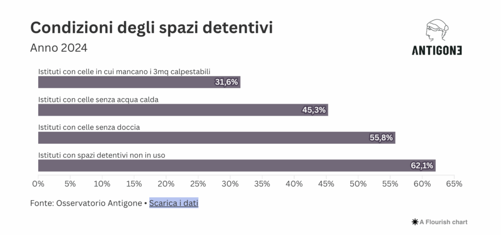 Tale situazione si andrebbe così a sommare a un quadro già critico, per usare un eufemismo. Visto che, spiega l’associazione nel rapporto, “le visite dell’Osservatorio di Antigone fatte nel corso del 2024 hanno portato alla luce il fatto che tali standard minimi di vivibilità non sono assicurati ovunque: nel 31,6% dei casi c’erano celle in cui non erano stati garantiti nemmeno i 3 mq calpestabili a persona; nel 45,3% degli istituti visitati abbiamo visto celle in cui non era disponibile acqua calda per tutto il giorno e in ogni periodo dell’anno; nel 55,8% dei casi celle in cui non era presente la doccia; mentre ben 59 istituti di pena, pari al 62,1% del totale, presentavano spazi detentivi non in uso per ristrutturazione e inagibilità”.