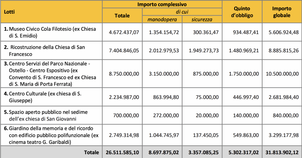 L’Ufficio Ricostruzione Post Sisma 2016 della Regione Lazio avvia la gara per la conclusione di accordi quadro quadriennali, con un unico operatore per lotto, per la realizzazione dei lavori relativi agli interventi di ripristino di sei immobili vincolati nel centro storico del comune di Amatrice (RI) nonché eventuali ulteriori interventi affini ricompresi nell’Ordinanza Speciale n. 2 del 6 maggio 2021 e ss.mm.ii. Il costo complessivo degli interventi in gara ammonta a circa 41 milioni ed è interamente finanziato con i fondi pubblici a disposizione del Commissario Straordinario del Governo per la ricostruzione nei territori dei Comuni delle Regioni di Abruzzo, Lazio, Marche e Umbria interessati dall’evento sismico del 24 agosto 2016. L’importo globale stimato in gara ammonta a 31.813.902,12 euro ed è ripartito in sei lotti come di seguito dettagliati.