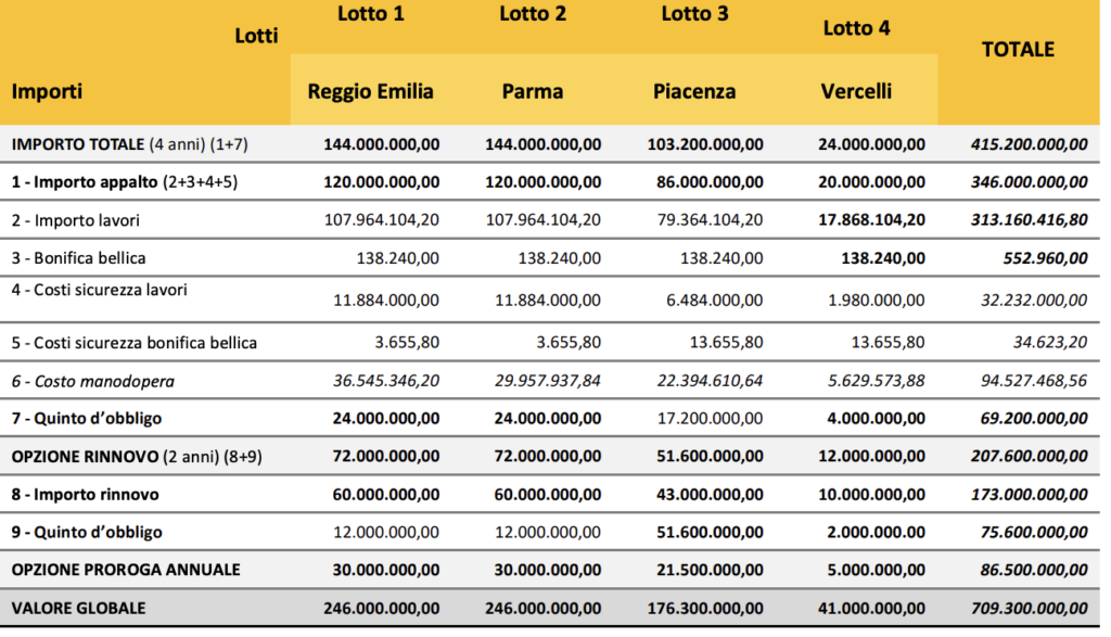 Il valore globale massimo degli accordi quadro in gara ammonta a 709.300.000,00 euro ed è suddiviso nei seguenti 4 lotti.