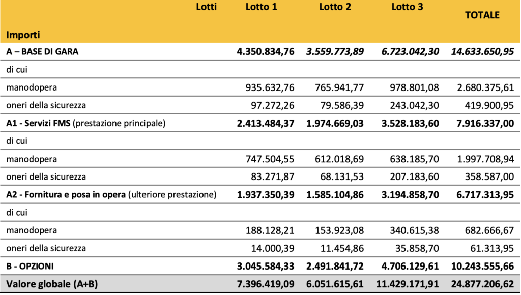 RFI SpA pubblica il bando per l’affidamento dei servizi di manutenzione “Full Maintenance Service” (FMS) e relativa fornitura con posa in opera di dispositivi di lubrificazione delle rotaie da mettere in servizio sulle linee dell’Infrastruttura Ferroviaria Nazionale. Il valore globale massimo degli accordi quadro in gara ammonta a 24.877.206,62 euro ed è suddiviso nei seguenti 3 lotti.