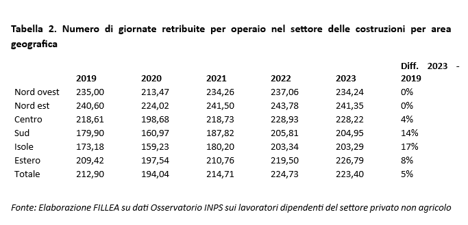 Interessante notare che il numero di giornate retribuite per operaio nel periodo considerato, stabile al Nord, cresce considerevolmente al Sud e nelle Isole nel periodo osservato. Le giornate retribuite passano da 219 a 228 al Centro (+4%), da 180 a 205 al Sud (+14%) e da 173 a 203 nelle Isole (+17%).