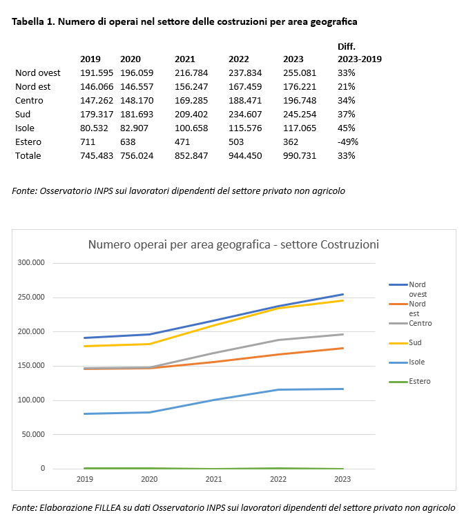 Come anticipato, tra il 2019 e il 2023 gli operai edili crescono del 33% (da 745.483 a 990.731), una crescita che tocca punte del 37% al Sud e addirittura del 45% nelle Isole.