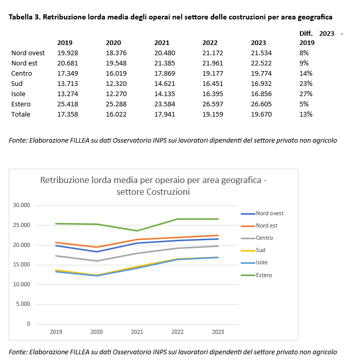 In termini di retribuzione lorda si registra un incremento del 13% tra il 2019 e il 2023, da 17.358 € medi per operaio a 19.670 €. Anche in questo caso la dinamica è dovuta soprattutto al 2022 e al dato delle dichiarazioni delle ripartizioni meridionali.