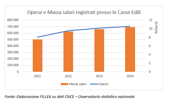 Analogamente, i dati della bilateralità, e in particolare dell’Osservatorio Statistico della CNCE, segnalano un aumento costante degli operai tracciati dalle Casse Edili, che crescono anche nel 2024, raggiungendo le 705.977 persone, +4% rispetto ai 675.602 del 2023, superando i 10 miliardi di € come massa salari complessiva. Solamente le rilevazioni dell’ultimo trimestre del 2024 e di gennaio 2025 stimano una prima flessione nel numero di operai.