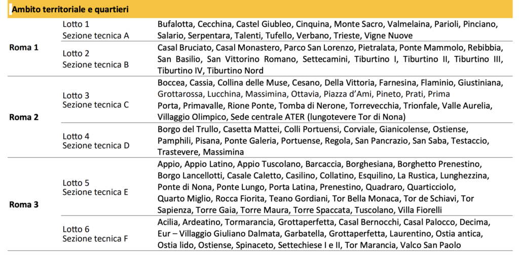 ATER Roma manda in gara i servizi di riparazione e manutenzione e i lavori di manutenzione ordinaria e straordinaria sugli immobili di proprietà o in gestione (circa 48.000 alloggi, oltre a locali commerciali, spazi comuni e aree libere), suddivisi in 6 lotti territoriali coincidenti con le sezioni tecniche. Le attività di ciascun lotto, che comprendono prestazioni diverse per contenuto, modalità e tempi di esecuzione, si articolano nelle seguenti due macrocategorie: – servizi di riparazione e manutenzione, volti a risolvere le problematiche segnalate dagli inquilini e a ripristinare le condizioni di funzionalità e di sicurezza di tutte le componenti edilizie e impiantistiche alterate per vetustà o usura; – lavori di manutenzione ordinaria e straordinaria e di restauro e risanamento conservativo, per rinnovare e sostituire parti anche strutturali degli edifici, nonché per realizzare ed integrare i servizi igienico sanitari e tecnologici degli edifici e delle aree di pertinenza. Il valore globale massimo dei servizi e lavori in gara ammonta a 30.240.000 euro (21.190.000 euro a base di gara e 8.340.000 euro per quinto d’obbligo e proroga tecnica) ripartito nei seguenti sei lotti territoriali (sezioni tecniche) di pari importo (5.040.000 euro per lotto).