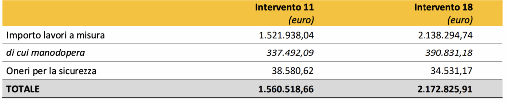 Agli operatori economici partecipanti a ciascun intervento è richiesta la qualificazione alle categorie SOA: OG3 strade, autostrade, ponti, viadotti, ferrovie, linee tranviarie, metropolitane, funicolari, e piste aeroportuali (prevalente per l’intervento 11), OG6 acquedotti, gasdotti, oleodotti, opere di irrigazione e di evacuazione (prevalente per l’intervento 18) e OG10 impianti per la trasformazione alta/media tensione e per la distribuzione di energia elettrica in corrente alternata e continua ed impianti di pubblica illuminazione.