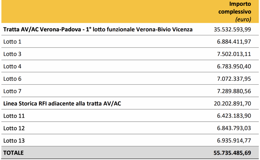 IRICAV DUE SpA, in qualità di General Contractor per la progettazione esecutiva e la realizzazione della nuova tratta AV/AC Verona-Padova, avvia due gare a procedura ristretta per l’affidamento della fornitura e posa in opera di barriere antirumore sulla tratta AV/AC Verona-Padova dal km 0+000 al Km 44+250. La gara di maggiore importo è relativa alla fornitura e posa in opera di barriere antirumore nell’ambito dei lavori di realizzazione della tratta AV/AC Verona-Padova, 1° Lotto Funzionale Verona – Bivio Vicenza ed è articolata in 5 lotti; l’altra gara è relativa alla fornitura e posa in opera di barriere antirumore sulla Linea Storica RFI adiacente alla tratta AV/AC Verona-Padova. L’importo complessivo dei lavori in gara ammonta a 55.735.485,69 euro come di seguito dettagliato.