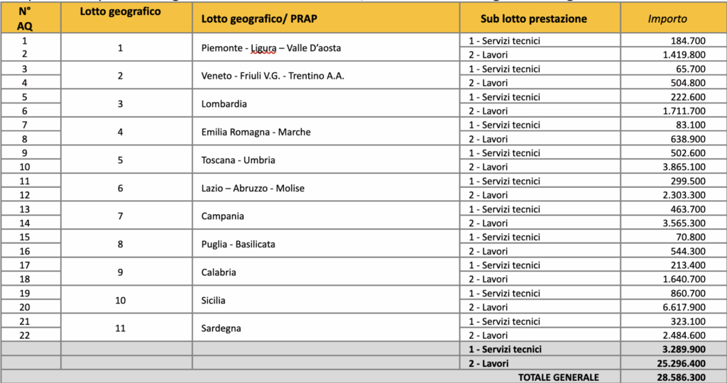 La procedura è articolata in 11 lotti geografici suddivisi in 2 sub-lotti prestazionali aventi ad oggetto servizi tecnici, ovvero servizi di progettazione, direzione lavori e coordinamento della sicurezza in fase di progettazione e di esecuzione (sub-lotto prestazionale 1), e l’esecuzione di lavori (sub-lotto prestazionale 2).
