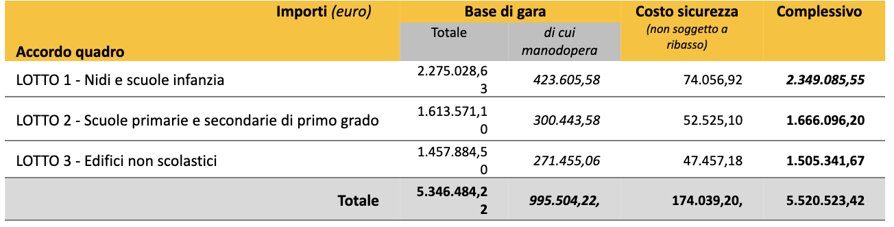 L’importo complessivo degli interventi in gara, articolati in 3 lotti, ammonta a 5.520.523,42 euro come di seguito dettagliato.
