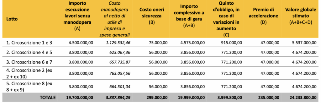 L’importo globale in gara ammonta a 24.233.800,00 euro come di seguito dettagliato.