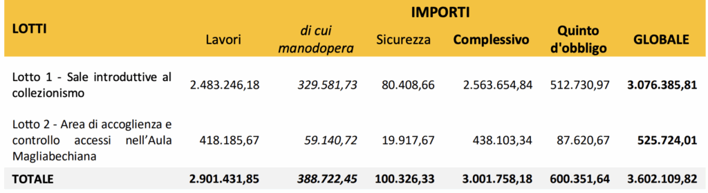 L’affidamento è suddiviso nei seguenti due lotti: – Lotto 1, sale introduttive al collezionismo – lavori di allestimento del sistema degli accessi e dell’area di accoglienza presso l’Aula Magliabechiana e delle sale introduttive sulla storia delle collezioni al piano terra delle Gallerie degli Uffizi, per la parte relativa alle sale di accoglienza al pubblico destinate alla storia delle collezioni degli Uffizi; – Lotto 2, area di accoglienza e controllo accessi nell’Aula Magliabechiana – lavori di allestimento del sistema degli accessi e dell’area di accoglienza presso l’Aula Magliabechiana e delle sale introduttive sulla storia delle collezioni al piano terra delle Gallerie degli Uffizi, per la parte relativa all’area di accoglienza e controllo degli accessi nell’Aula Magliabechiana.