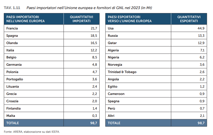 Leggendo dai dati della relazione completa, nel 2023 l’Italia ha importato 10,8 metri cubi di gas naturale in meno rispetto al 2022 (-14,8%). La quota di importazioni di gas dalla Russia si è quasi azzerata dal 2022 a oggi passando da 29,2 G(m3) del 2021 a 2,9 G(m3) nello scorso anno. In termini percentuali, quindi, l’apporto di Mosca è sceso dal 40 al 4,7%. I nuovi partner energetici per il nostro Paese sono sempre più l’Azerbaigian (per il gas via tubo) e poi Algeria, Qatar, Norvegia e Usa per il gas via nave (88% del totale). Il gnl importato è salito del 70% negli ultimi due anni e l’attuale quadro di importazione del gas (61, 2 metri cubi) vede: 25,5 dall’Algeria, 10 dall’Azerbaigian, 6,8 dal Qatar, 5,3 dagli Stati Uniti, 6,6 da Norvegia e Olanda, 2,5 dalla Libia e i restanti 2 da altri paesi. Nel 2023 quasi un terzo dei 61,2 G(m3) importati in Italia, cioè 14,5 G(m3), sono giunti via nave. Altri partner sono: la Spagna (4,6%), la Nigeria (1,7%) e l’Egitto (1,6%).