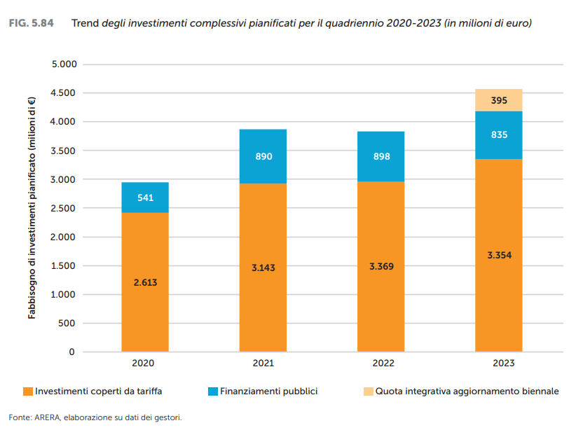 Proprio in tema di investimenti, dalla relazione completa si legge che “nel corso del 2023 l’Autorità ha proseguito le istruttorie volte all’approvazione dell’aggiornamento biennale (2022-2023) delle predisposizioni tariffarie. Alla data del 31 dicembre 2023, gli atti di determinazione tariffaria adottati dall’Autorità, per il biennio 2022-2023, hanno riguardato complessivamente 67 gestioni, interessando 30.830.746 abitanti. Con riferimento al campione, composto da 130 gestioni per le quali la proposta di aggiornamento biennale delle predisposizioni tariffarie è stata trasmessa all’Autorità (che servono complessivamente 48.736.089 abitanti), la variazione media (rispetto all’anno precedente) dei corrispettivi applicati all’utenza nel 2023 risulta pari a +4,56% con una certa eterogeneità a livello geografico: +3,67% nell’area Sud e Isole, +3,97% nel Nord-Est, +4,22% nel Centro, e a +5,87% nel Nord-Ovest”.