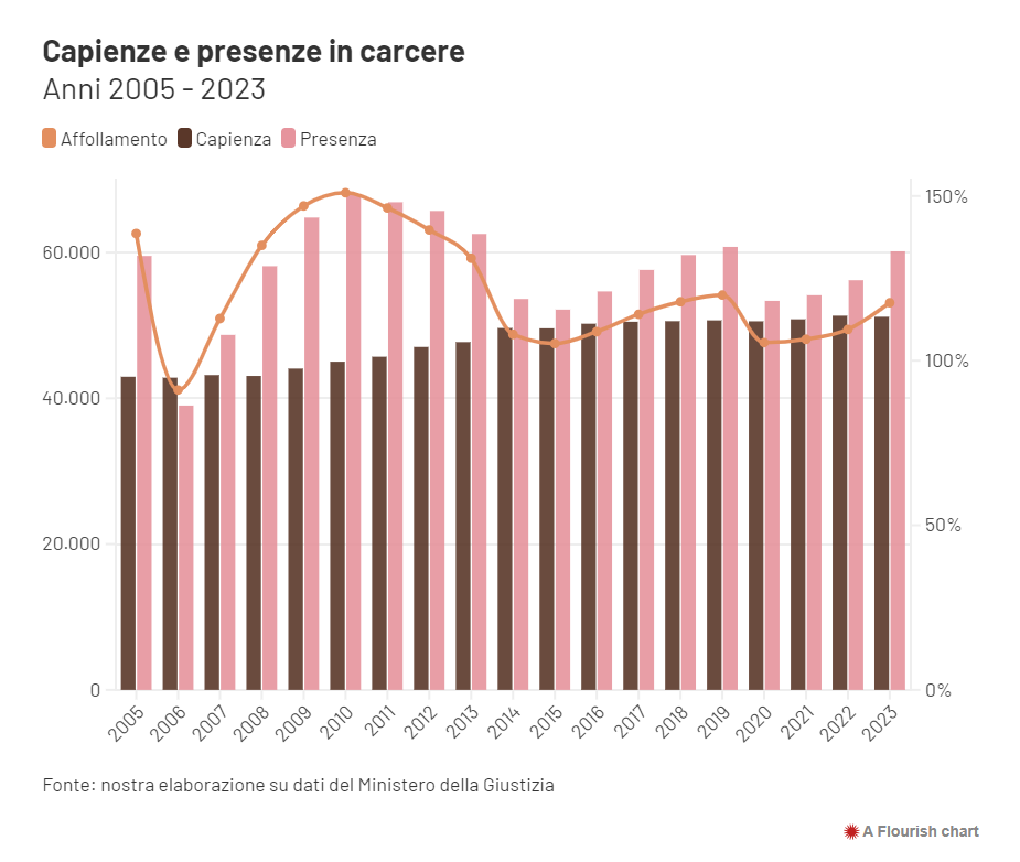Il lavoro da fare, dicevamo, sarà grande. Solo negli ultimi dodici mesi si sono aggiunti 4mila detenuti, come registrato da Antigone “il tasso di affollamento è del 130,4% (al netto dei posti conteggiati dal Ministero della Giustizia ma non realmente disponibili)” con 61.480 detenuti su 51.234 posti disponibili al 30 giugno 2024. Ancor più drammatico è che “sono ormai 56 gli istituti in cui il tasso di affollamento è superiore al 150% e ben 8 quelli in cui è superiore al 190%”, si legge dal dossier dell’associazione che dal 1991 si occupa del sistema Penitenziario e penale italiano. In alcuni casi si supera il 200%, come negli istituti di Milano San Vittore maschile e Brescia Canton Mombello.