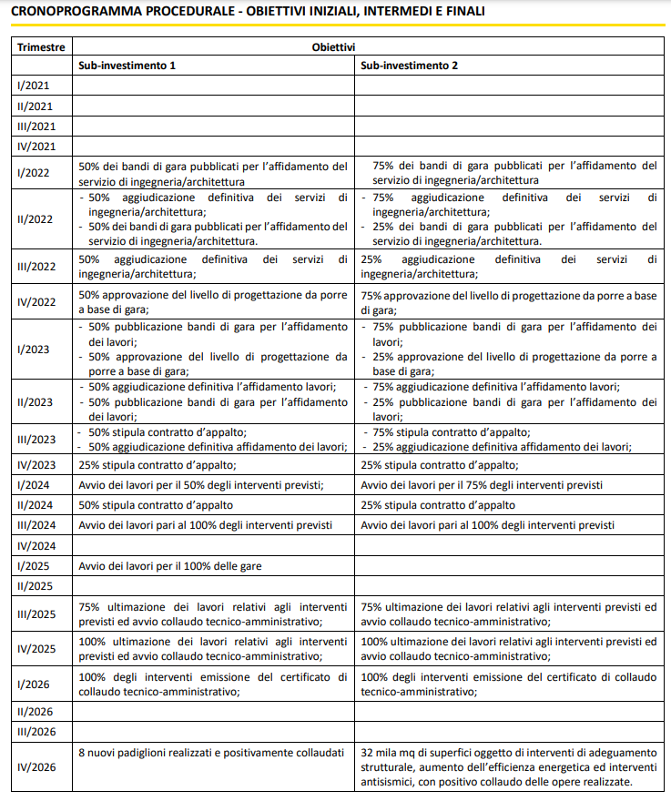 50% degli interventi previsti. Quanto al secondo sub-investimento, sull’obiettivo del 100% di stipula del contratto d’appalto, l’obiettivo è “non conseguito”. Inoltre, “ai dati forniti dall’amministrazione 2 interventi su 4 hanno raggiunto la fase di aggiudicazione definitiva (50%), di cui per 1 intervento risulta stipulato un contratto di lavori (25%). I Cup per cui non risulta pubblicato il bando hanno rispettivamente un finanziamento Pnc di 25 milioni di euro e 9,8 milioni di euro. Per i 2 interventi è stato tuttavia affidato un appalto per progettazione, anche esecutiva, per circa 1 milione di euro nonché due incarichi per circa 500 mila euro. Si riscontrano in ogni caso disallineamenti rispetto alle risultanze del sistema di monitoraggio”.