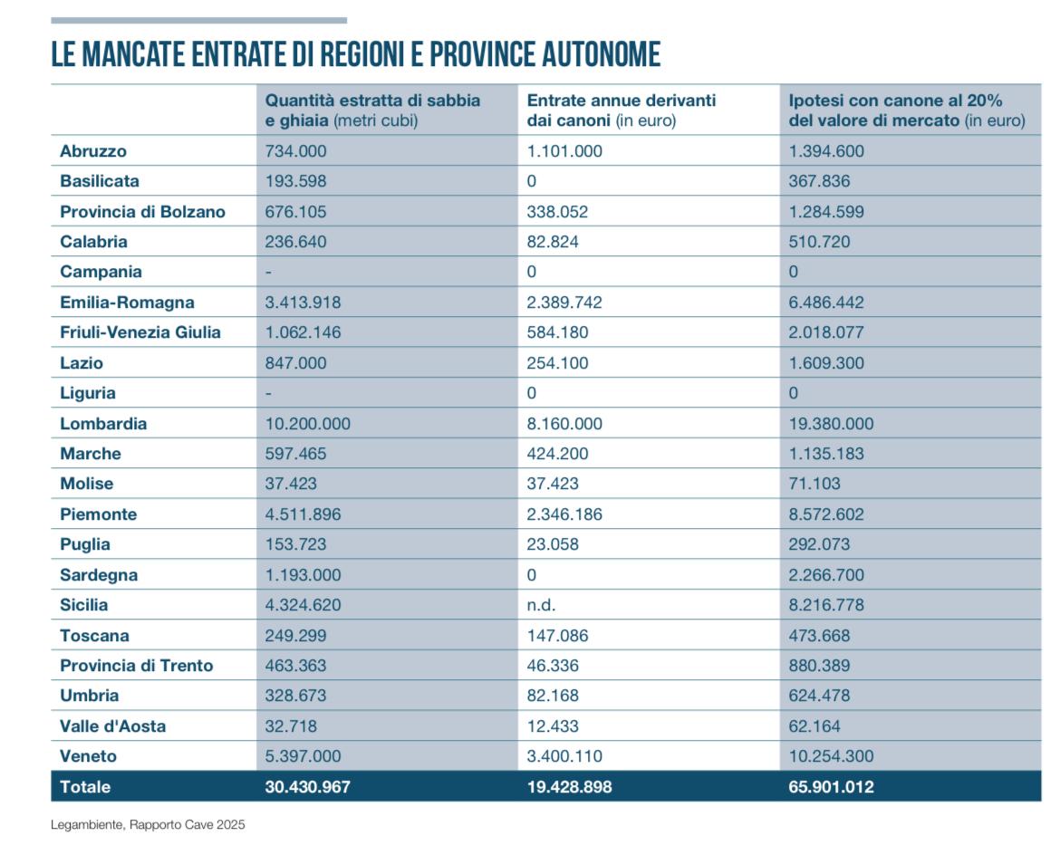 Il nodo principale resta quello economico: i canoni di concessione per le attività estrattive restano irrisori — in alcune Regioni inferiori a 0,50 euro per metro cubo. Il gettito complessivo per le casse pubbliche non supera 20 milioni di euro l’anno, ma secondo le stime di Legambiente, portando le tariffe al 20% del valore di mercato (sul modello britannico), l’incasso potrebbe salire a 66 milioni, con 46,5 milioni di euro di entrate oggi mancate.