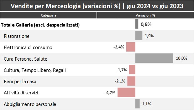 Con riferimento al solo mese di giugno 2024, rispetto allo stesso periodo del 2023, a spingere la crescita sono la cura persona e salute (+10%), supportata dalle ottime performance di ottica e profumeria, mentre la Ristorazione (+1,9%) e l’abbigliamento (+1,1%) continuano a registrare trend positivi, anche se in tono minore. In particolare, per quest’ultima categoria merceologica, le medie superfici hanno registrato andamenti migliori rispetto ai negozi di piccolo taglio. Negativi, invece, gli andamenti di attività di servizi (-4,7%), elettronica di consumo (-2,4%), beni per la casa (-2,1%) e cultura, tempo libero, e regali (-1,7%).