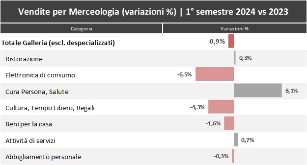 Le categorie che, comunque, hanno registrato le migliori performance nei primi sei mesi dell’anno rispetto allo stesso periodo del 2023, sono: cura persona e salute (+8,1%) e attività di servizi (+0,7%). Stabili, invece, i trend registrati da ristorazione (+0,3%) e abbigliamento (-0,3%). In calo elettronica di consumo (-6,5%), cultura, tempo libero e regali (-4,3%) e beni per la casa (-1,6%).
