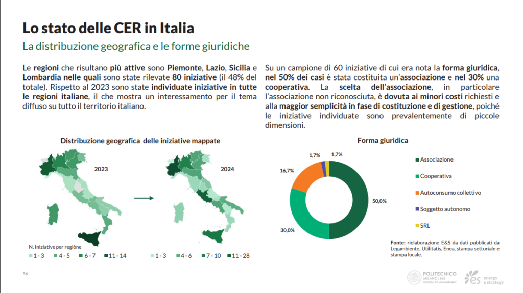 Le due caratteristiche delle cer attualmente sono da un lato la presenza di promotori pubblici e/o enti specializzati: per il PoliMi questi ultimi ci sono nel 79% dei casi mentre i primi sono protagonisti nel 58% dei casi. Dall’altro, c’è il tema del poco interesse popolare alle cer: secondo un sondaggio effettuato per il report dal Politecnico di Milano, “il 79% non partecipa a una