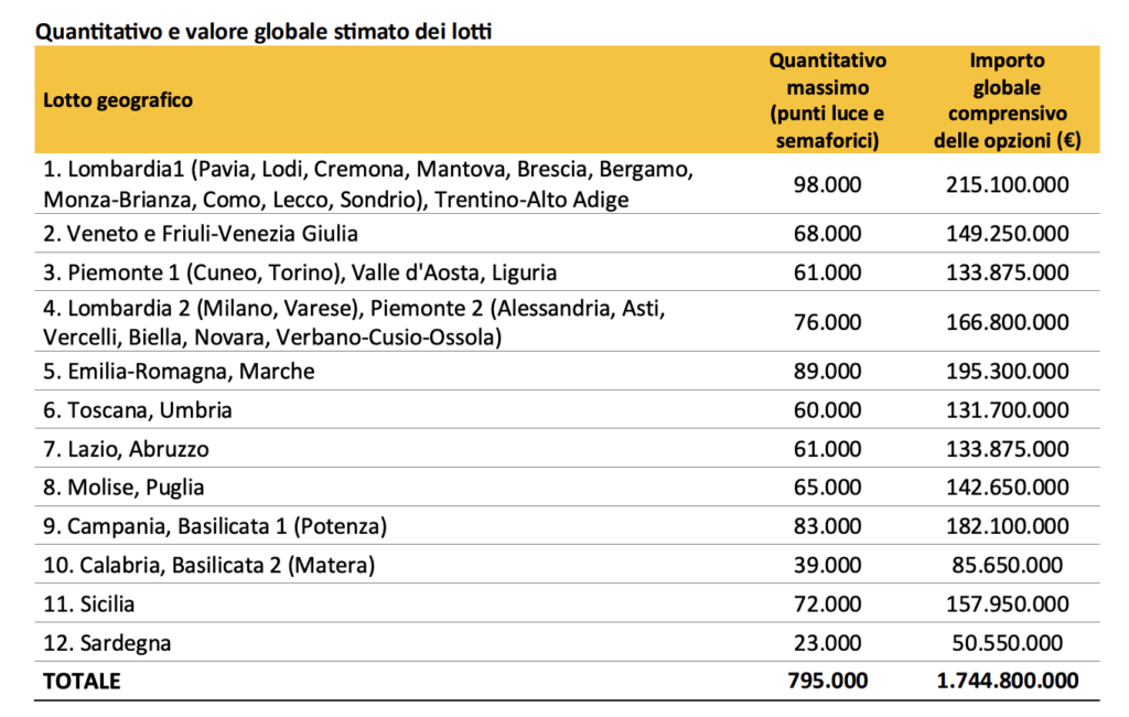 CONSIP manda in gara accordi quadro triennali, con più operatori economici per ogni lotto, per l’affidamento integrato del servizio luce, che consiste nella gestione, manutenzione ed efficientamento degli impianti di illuminazione pubblica tramite un contratto “a risultato” (Energy Performance Contract), del servizio semaforico (con le stesse modalità del servizio luce) e di altri servizi ad alto contenuto tecnologico quali i servizi smart city e BIM per la rappresentazione dell’infrastruttura. Il valore globale massimo degli accordi quadro in gara ammonta a 1,745 miliardi, per 795.000 punti luce e semaforici complessivi, suddivisi in 12 lotti geografici. Di seguito è presentato il quadro dei lotti in gara.