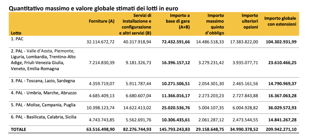 In tale lotto ci si attende una forte competizione delle società più grandi e delle Telco) e 5 lotti geografici per le Pubbliche Amministrazioni Locali (PAL) mono-aggiudicatario (per favorire la partecipazione di imprese operanti su aree geografiche più circoscritte e di prossimità e consentire una partecipazione più ampia, potenzialmente anche da parte di PMI). Il valore globale massimo degli accordi quadro in gara ammonta a 209.942.271,12 euro come di seguito dettagliato.