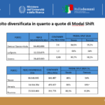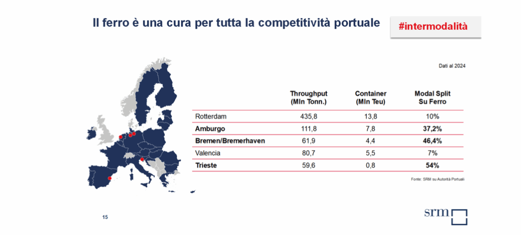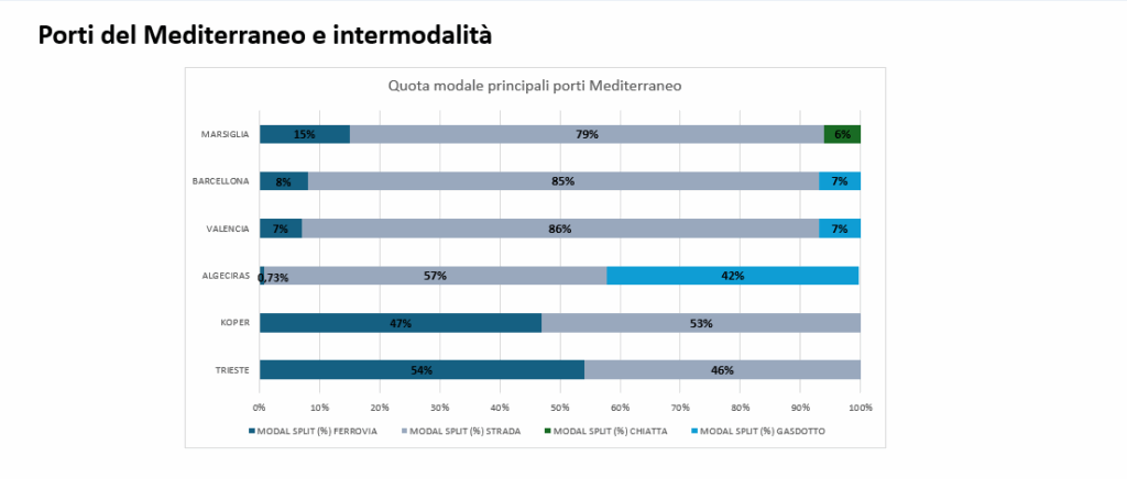 Nella tabella dei porti principali si può notare come Trieste abbia la quota di modal split su ferrovia più alta, al 54%, contro un 46% su strada. Segue La Spezia al 34% (e 66% su strada), poi Livorno (16,3%). Allargando all’Europa, Brema registra un 46,4% di intermodalità su ferro; Amburgo 37,2% e Rotterdam 10%.