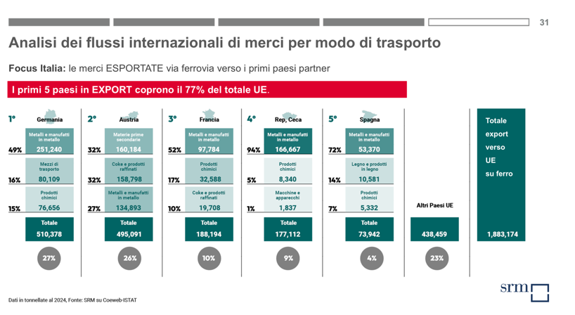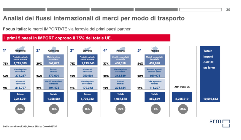 Quanto ai flussi, nel 2024 l’import-export italiano è ammontato a 428 milioni di tonnellate di cui il 3,3% su treno. Per il 90%,  gli scambi via ferro con l’estero dominano dentro l’Unione Europea. E i primi cinque partner coprono il 75% dei traffici, con Germania e Ungheria in testa (20 e 19%).