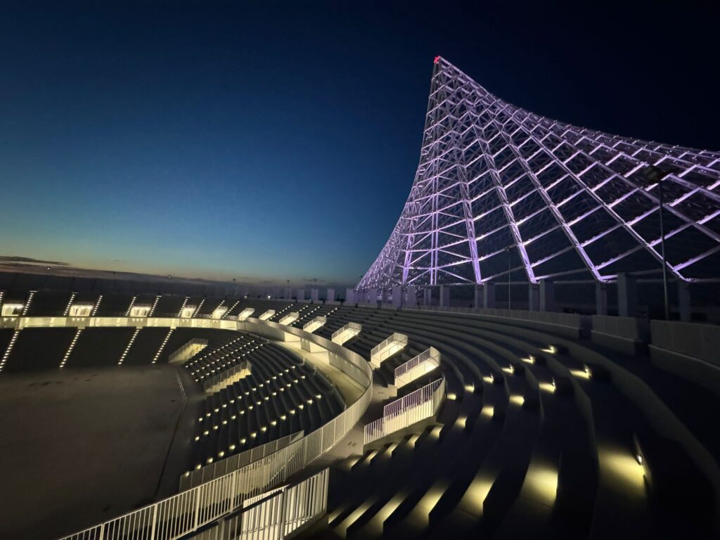Gli interventi realizzati dall’Agenzia, con le più’ innovative tecnologie e materiali, in questa prima fase hanno riguardato innanzitutto le strutture portanti del Palanuoto e del Palasport, con operazioni di consolidamento e collaudo statico. Il Palasport è stato completato con un’arena scoperta capace di ospitare 8.000 spettatori seduti. L’intera area esterna è stata riqualificata con opere di viabilità, parcheggi, sistemazione a verde e nuovi sottoservizi. Un progetto di riforestazione ha previsto la piantumazione di 460 alberi, 600 siepi e 6.000 piante arbustive, contribuendo a una significativa riduzione di CO₂. Anche l’illuminazione della vela è diventata un fattore di attrattività. Il progetto di light design ha vinto il prestigioso premio internazionale Darc Awards 2025.