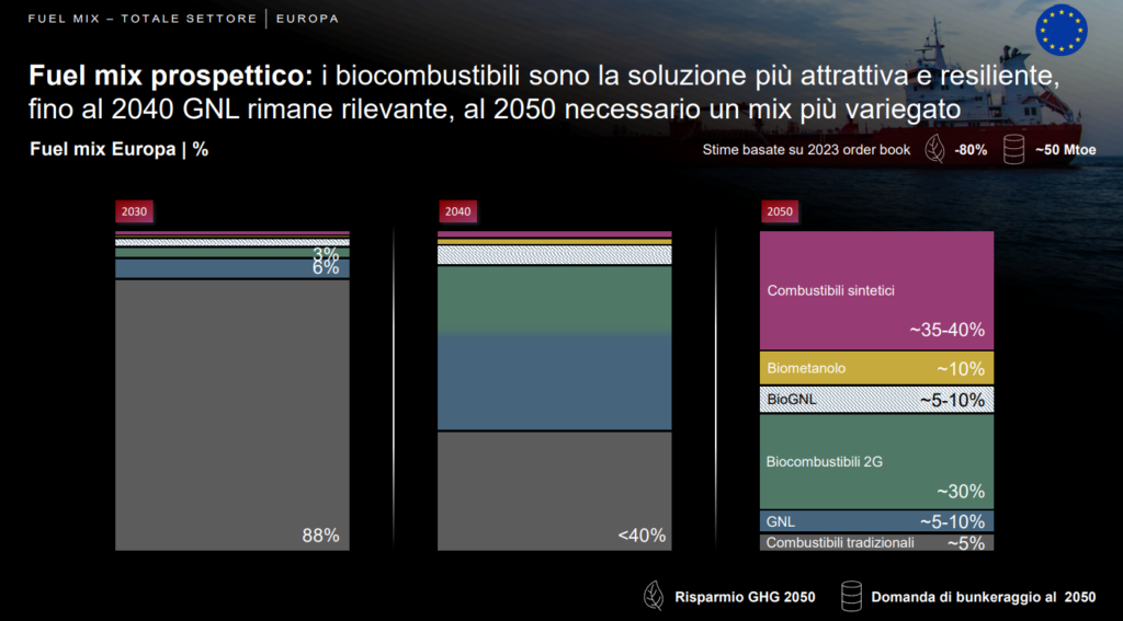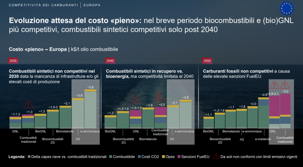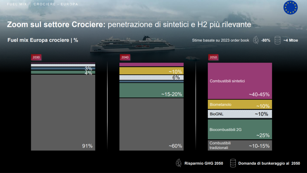 Come detto, in una seconda fase interverranno sempre più anche i carburanti sintetici prodotti da idrogeno verde, che diventeranno tuttavia competitivi rispetto ai combustibili fossili solo dal 2040. Nel lungo termine, i biocarburanti prodotti da materie prime rinnovabili e i carburanti sintetici saranno cruciali per la decarbonizzazione delle navi mercantili di medio e lungo raggio, mentre le bioenergie saranno sufficienti per le navi a corto raggio. Per quanto riguarda le crociere, oltre ai biocombustibili Hvo si prevede l’utilizzo di combustibili sintetici per le navi del segmento di medio-piccola taglia (luxury e exploration), mentre per le navi di grande/media taglia (upper premium e contemporary) si prevede una maggiore dipendenza dalle bioenergie, come biocarburanti Hvo, biognl e biometanolo.