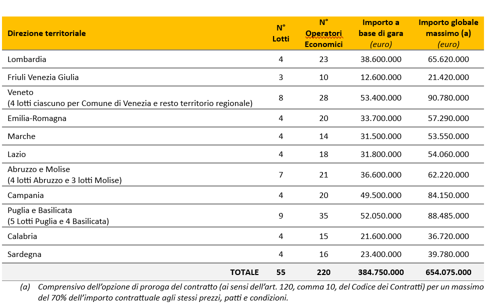 Il valore globale massimo degli accordi quadro in gara ammonta a 654.075.000 euro suddiviso nei seguenti 55 lotti territoriali.