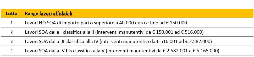 Gli accordi quadro in gara, relativi a interventi manutentivi su immobili prevalentemente destinati ad uso ufficio, sono riconducibili alle categorie SOA OG1 (edifici civili e industriali), OG2 (restauro e manutenzione dei beni immobili sottoposti a tutela) e OG11 (impianti tecnologici) e sono articolati nei seguenti quattro lotti tipo sulla base della dimensione economica dei lavori da affidare.