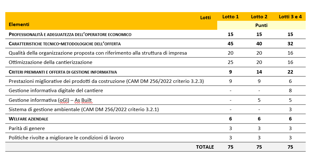 Il criterio di aggiudicazione scelto è quello dell’offerta economicamente più vantaggiosa, con 25 punti per l’offerta economica e 75 punti per l’offerta tecnica. Nella tabella di seguito riportata è presentato il quadro di sintesi degli elementi e dei punteggi per la valutazione dell’offerta tecnica per singolo lotto, sulla base delle informazioni indicate nei disciplinari.