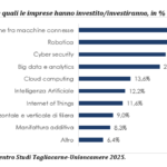 Scendendo nel dettaglio si nota come il 56% delle imprese investe in digitale spinto dalla volontà di aumentare l’efficienza interna e/o di ridurre i costi, con picchi del 63,2% tra le grandi imprese con più di 50 addetti. A seguire, tra le principali motivazioni ad investire in queste tecnologie troviamo anche il miglioramento dei livelli qualitativi della produzione segnalato dal 21,9% delle imprese, una quota che sale al 23% per quelle di piccole dimensioni. Mentre il 12,3% investe nella transizione digitale spinto dagli incentivi, anche in questo caso la quota appare più elevata nel caso delle piccole imprese (14,3%).