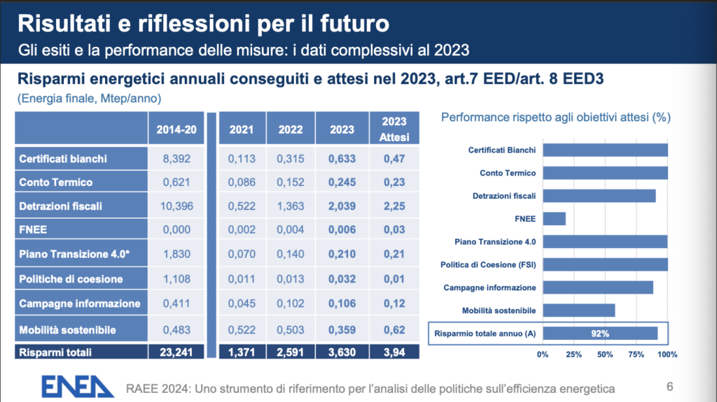 Più in generale, però, risulta ancora preponderante il traino delle detrazioni fiscali (circa 2 Mtep pari a una quota del 56,2% dei risparmi totali 2023). Oltre a queste misure, la riduzione dei consumi di energia finale è attribuibile alla crescita dei Certificati Bianchi che ha raggiunto il 28% rispetto al 2022, spingendo il dato cumulato a 0,6 Mtep, agli incentivi per la mobilità sostenibile (0,4 Mtep) e al Conto Termico (0,3 Mtep). Sono risultati in aumento, dice Enea, anche i risparmi energetici conseguiti nell’ambito dei progetti realizzati attraverso i Fondi di coesione, con un risparmio di energia finale di circa 31,8 ktep/anno al 2023. E poi, c’è da segnalare il ruolo giocato dalle campagne di sensibilizzazione che hanno coinvolto quasi 14 milioni di cittadini per quanto concerne il settore residenziale. La stima dei risparmi indotti dai cambiamenti nei comportamenti di consumo, da parte di individui e imprese, è pari a oltre 0,1 Mtep.