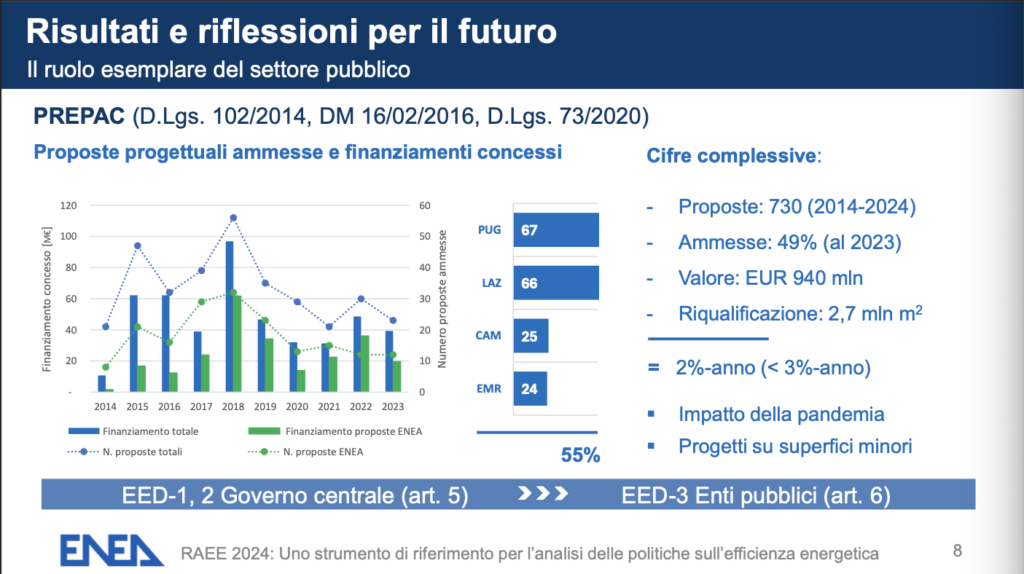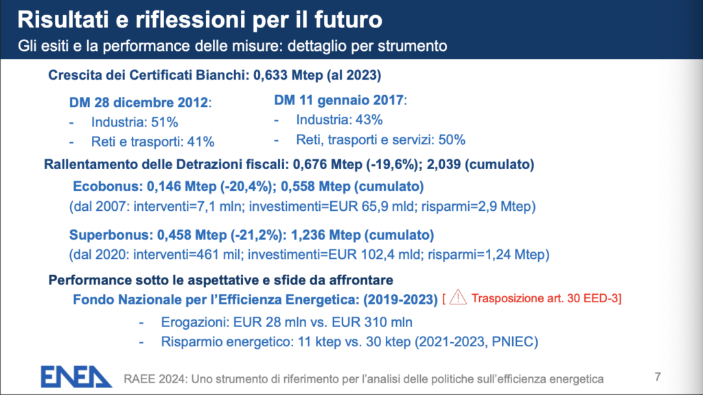 Edifici: classi F e G sotto al 50%, PIU’ attestati di riqualificazione. I nuovi risparmi (oltre 3,6 Mtep) coprono i consumi di Lazio e Toscana ma la transizione è lenta: speso solo il 34% dei fondi Pnrr