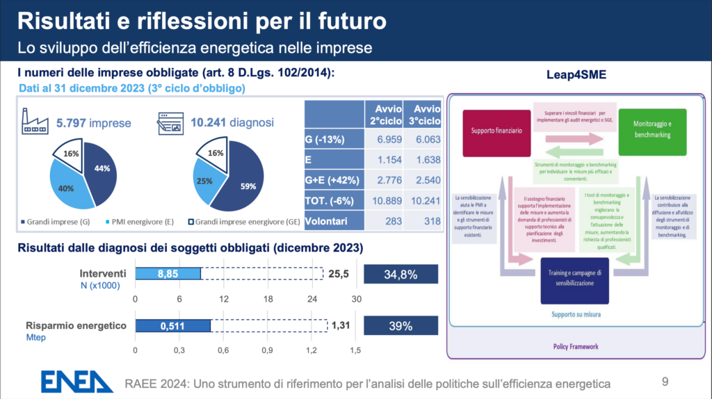 Sul fronte dell’efficienza energetica negli usi finali, spiega ancora il rapporto, un notevole contributo è arrivato dalle aziende con l’avvio il 5 dicembre 2023 del terzo ciclo di audit energetici obbligatori per le grandi imprese e quelle energivore. Secondo i dati gestiti da Enea, sono pervenute 10.241 diagnosi da 5.797 soggetti obbligati, di cui il 44% sono grandi imprese, il 40% PMI energivore ed il 16% grandi imprese energivore. Rispetto a dicembre 2019 – che ha segnato l’avvio del secondo ciclo di diagnosi energetiche obbligatorie – le grandi imprese energivore che hanno adempiuto all’obbligo sono aumentate del 19%, mentre le grandi imprese sono diminuite dell’11%. I circa 9 mila interventi di efficientamento energetico effettuati hanno prodotto un risparmio pari a 0,5 Mtep. “I dati incoraggianti presentati nel Rapporto sono il risultato del peso sempre più rilevante assunto nel Paese dall’efficienza energetica. Questo grazie al consolidamento delle attività di formazione e informazione, ma anche allo sviluppo di metodologie e banche dati che hanno evidenziato il ruolo di primo piano assegnato all’Enea nel coinvolgere attivamente istituzioni, imprese, e cittadini”, sottolinea la direttrice del dipartimento Enea di Efficienza energetica Ilaria Bertini.