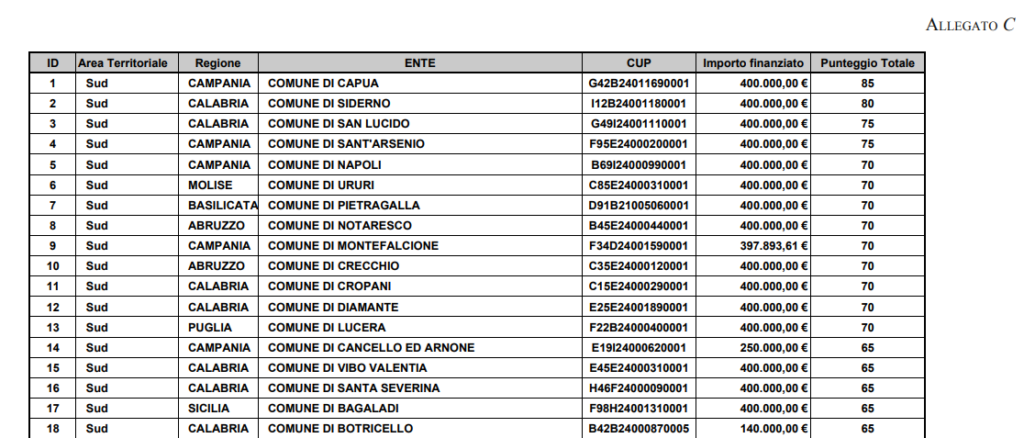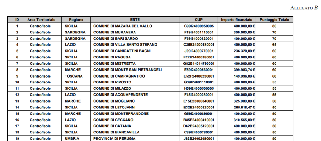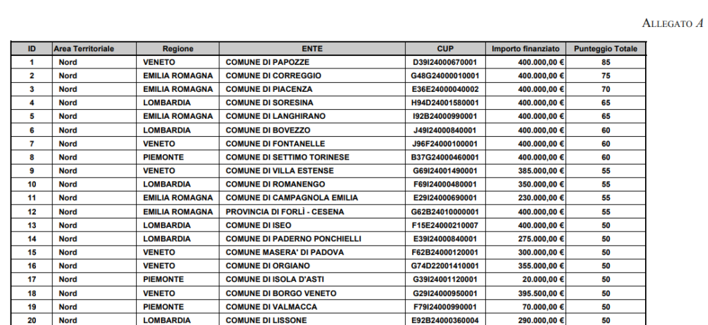 Come si legge nel testo, “l’importo da assegnare in favore degli enti utilmente collocati nelle graduatorie di cui all’art. 1 è pari a euro 6.670.500,00 per il Nord, a euro 6.787.483,29 per il Centro e Isole, a euro 6.787.893,61 per il Sud, per un importo complessivo pari a euro 20.245.876,90 a fronte di un importo massimo disponibile pari a euro 20.736.429,00”.