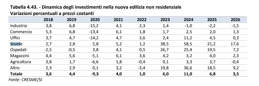 Cosa c’è invece sul tavolo in termini di investimenti negli edifici scolastici? Secondo il XXXVII° rapporto congiunturale del Cresme, “gli investimenti per le nuove scuole, ad esempio, sono cresciuti del 38,5% nel 2023 e del 58,5% nel 2024, a cui seguirà il +21,2% nel 2025 e il 17,6% nel 2026”. Le scuole di nuova realizzazione rientrano nella missione M2 del Pnrr, “Rivoluzione verde e transizione digitale”, componente 3 (efficienza energetica e riqualificazione degli edifici), investimento 1.1.