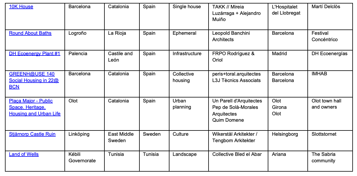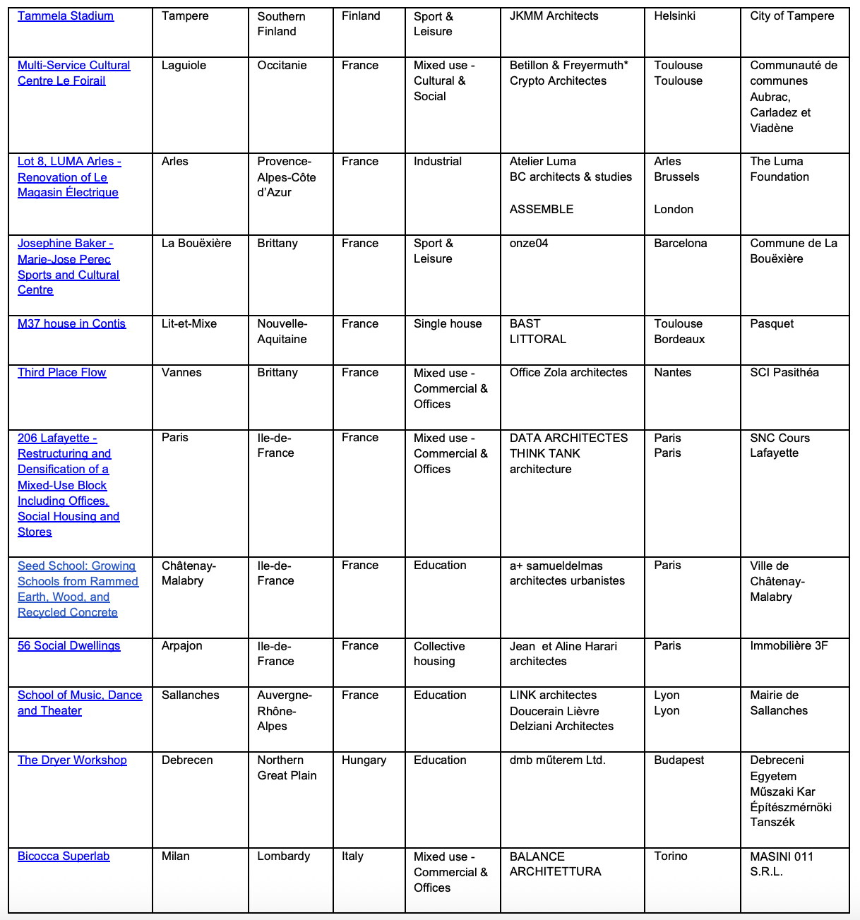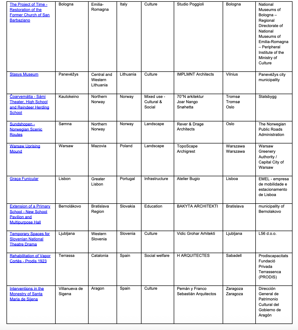 Le opere italiane sono due: il Bicocca Superlab di Milano (BALANCE ARCHITETTURA) e il progetto di ristrutturazione della chiesa bolognese di San Barbaziano (Studio Poggioli). A febbraio arriverà l’annuncio delle opere finaliste, ad aprile i vincitori.