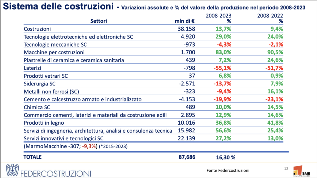 Guardando tutto ciò dal punto di vista dei singoli comparti, il rapporto Federcostruzioni illustra come le costruzioni salgano in valore produttivo rispetto al 2022 del 9,7%. Il boom spetta però alla filiera della progettazione e servizi innovativi: +16,7%. Stabili (-0,10%) le tecnologie, macchinari e impianti; mentre il vero crollo riguarda i materiali: -6,7% di perdita di valore tra 2022 e 2023. “L’Italia è la seconda manifattura dell’Europa”, ricorda Paola Marone – presidente di Federcostruzioni. “Le valutazioni qualitative dei diversi comparti rimangono in linea con quanto emerso a marzo”: nel 2023, Ance registra +5% di investimenti, Confindustria Ceramica una produzione in calo tra il 7% e il 14,4%, Federlegno segna -9,4% sui prodotti per l’edilizia, le macchine stradali per le costruzioni registrano invece un +2%.