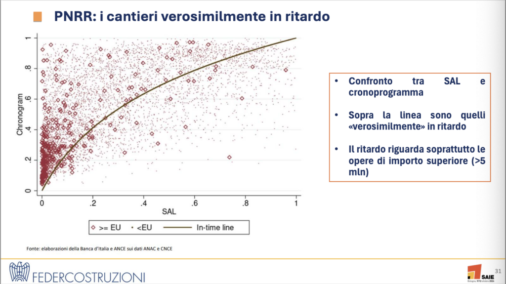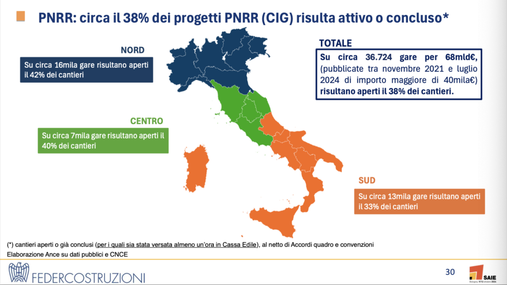 Il tutto, nell’era in cui il fattore Pnrr va svanendo (2026). Oggi, al 30 giugno 2024, la spesa totale è di 51,4mld (26% sui 194,4mld totali e 45% sul totale incassato dall’Italia). Escludendo il Superbonus, la spesa settoriale ammonta a 13mld di euro (71% di interventi in corso)