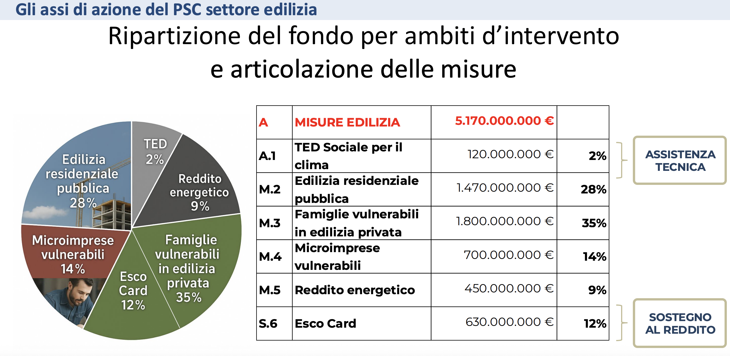 Guardando più da vicino al settore edilizio, le misure arrivano fino a poco più di cinque miliardi e si articolano in quattro misure riguardanti l’Erp, le famiglie vulnerabili in edilizia privata (ma si stima di raggiungere fino al 14% degli interessati), le microimprese fragili e il reddito energetico (su 1.650.000 famiglie considerate, il budget assegnato potrebbe interessare fino al 2% di tali nuclei). Al sostegno al reddito è previsto un contributo del 12% (su 180mila famiglie si stima di raggiungerne il 35%) mentre come assistenza tecnica si fissa un tetto del 2%.