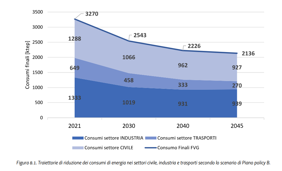 “A livello regionale la tendenza di consumi finali per il settore civile dello scenario Ref (cioè Pniec) è stimata essere pari a 1210, 1199 e 1180 ktep per gli anni 2030, 2040 e 2045, rispettivamente. Questo si traduce in una riduzione percentuale, rispetto all’anno di riferimento 2021, del 6% al 2030 e dell’8% al 2045. Secondo, invece, lo scenario A, più sfidante, si prevede un consumo finale stimato di 1112, 1073 e 1028 ktep per gli anni 2030, 2040 e 2045, pari ad una riduzione del 14% (2030), 17% (2040) e 20% (2045) rispetto al 2021. Lo scenario B, scelto come base di policy, prevede invece quote di riduzione del 17% al 2030, al 25% al 2040 e al 28% al 2045, con un consumo stimato di 1066, 962 e 927 ktep. Numeri, quindi, ancora più restrittivi.