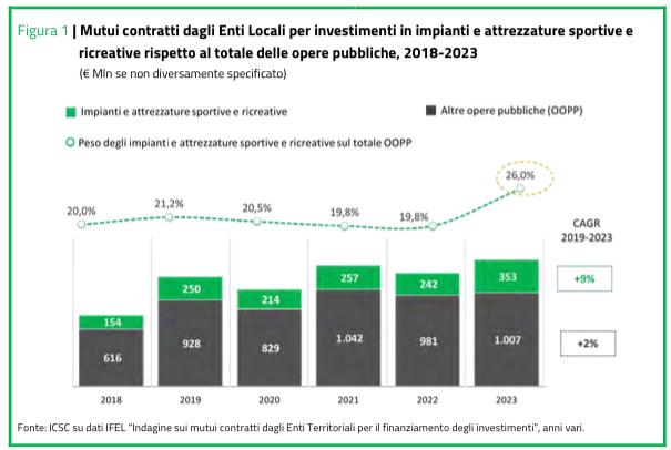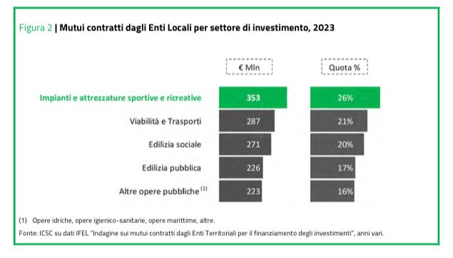 A scattare la fotografia del mercato degli investimenti e lo stato degli impianti sportivi in Italia è stato l’ultimo rapporto realizzato dal Servizio Studi e Sviluppo Sostenibile dell’Istituto per il Credito Sportivo e Culturale (ICSC) che evidenzia come gli investimenti pubblici in infrastrutture sportive, dopo l’inevitabile contraccolpo della pandemia, siano tornati non solo a crescere, ma lo hanno fatto ad un ritmo superiore rispetto agli investimenti in altre opere pubbliche e alimentando la domanda di prestiti a medio e lungo termine. Nel periodo 2019-2023 i comuni hanno destinato agli impianti sportivi il 22% dei finanziamenti contratti per le spese in conto capitale: oltre 1,3 miliardi di euro di investimenti contro 1,6 miliardi di euro per i progetti nel settore dei trasporti e i 900 miliardi assegnati a programmi di edilizia sociale. (Fig.1 e 2)
