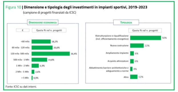 Una quota rilevante di investimenti si concentra nella fascia dei micro interventi (sotto i 60 mila euro) che riflette, sottolinea il report, da un lato, “la bassa patrimonializzazione delle imprese che limita la capacità di indebitamento, dall’altro, l’ampio ricorso ai mutui c.d. “light”1 erogati dall’ICSC, linea di credito totalmente garantita dal Fondo di Garanzia per l’impiantistica sportiva, destinata a piccole esigenze di investimento, quali l’acquisto di nuove attrezzature o interventi di manutenzione ordinaria”.