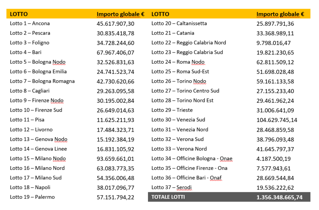 Il valore globale massimo degli accordi quadro in gara ammonta a 1.356.348.665,74 euro ed è suddiviso nei seguenti 37 Lotti.