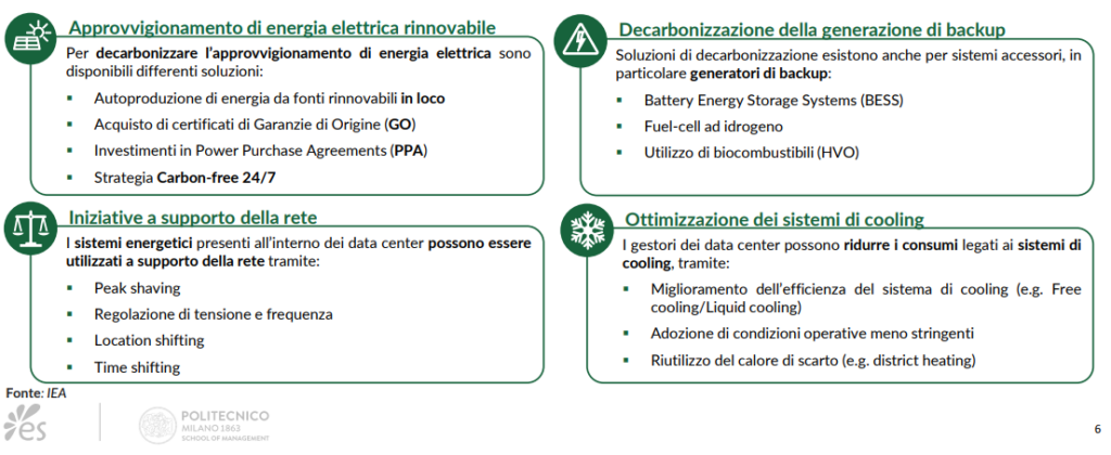 Infine, nel focus sui data center il rapporto spiega che sono almeno quattro gli ambiti di applicazione di soluzioni Ia per efficientarne e decarbonizzarne l’operato.